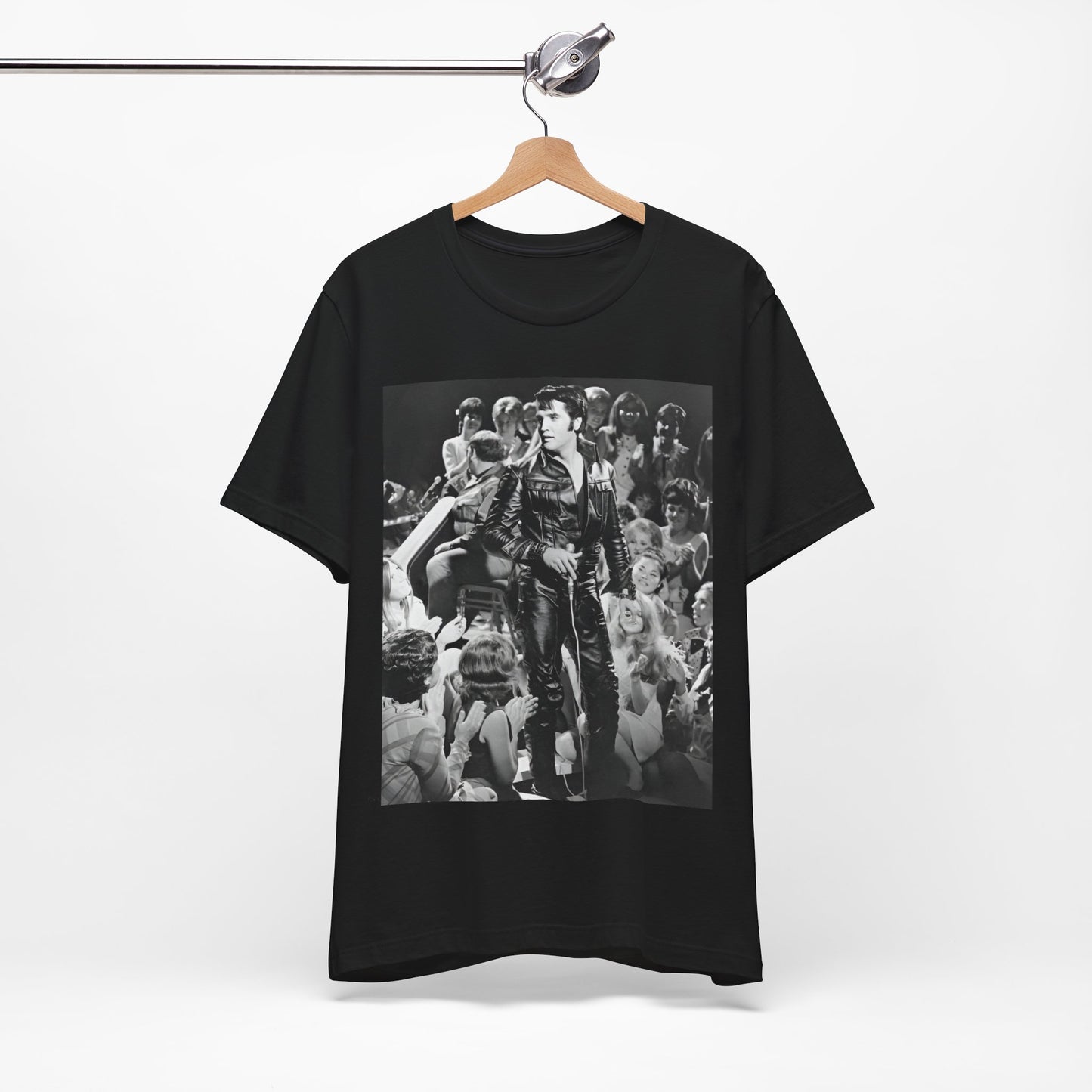 Step into the electrifying atmosphere of a legendary performance with the Elvis Presley Vintage On Stage B&W T-Shirt. This compelling shirt features a dynamic black and white graphic of Elvis Presley captivating audiences on stage, perfectly capturing his raw energy, powerful vocals, and unforgettable showmanship. It's a true homage to his undeniable live impact and global appeal.